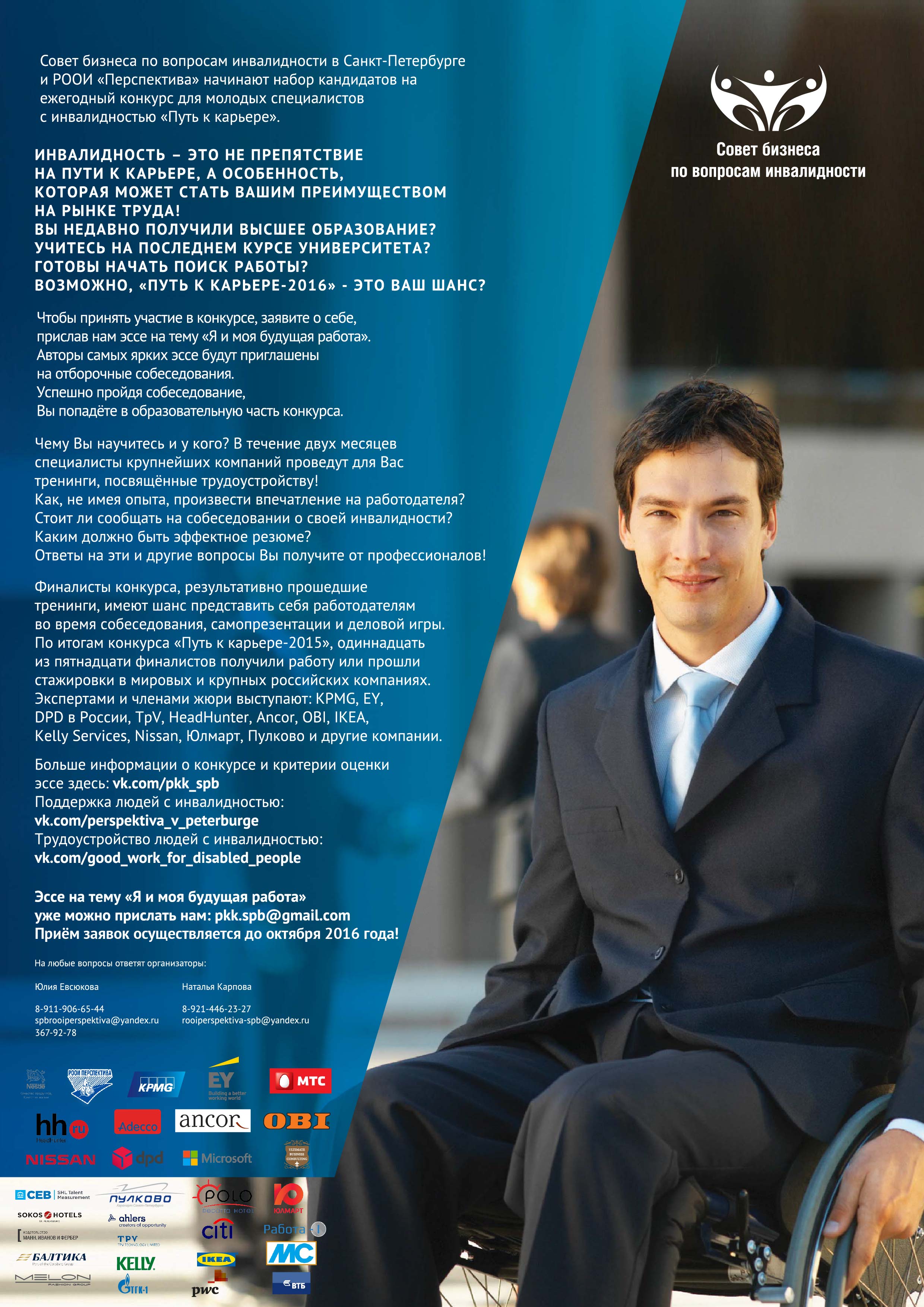 Ключевым мероприятием нашей организации и Совета является конкурс для молодых специалистов с инвалидностью «Путь к карьере», в результате которого получают стажировки и работу молодые люди с инвалидностью. В 2015 году конкурс проводился в Санкт-Петербурге впервые. В этом году до 1 октября мы проводим набор на конкурс, который пройдёт с октября по ноябрь 2016 года. https://vk.com/pkk_spb.